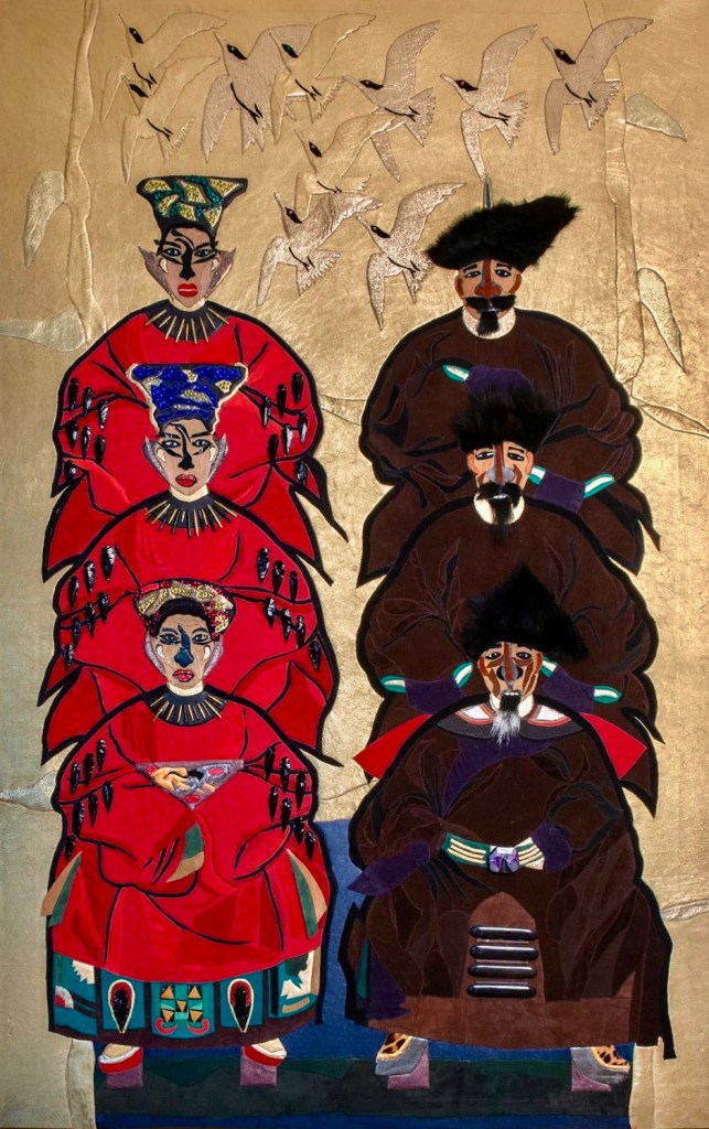 Fong-Leng: ‘Voor dit grote werk heb ik leer en suède in bijzondere kleuren gebruikt. Er zit ook bont in verwerkt. En om het werk nog sprekender te maken, verwerkte ik er ook natuursteentjes in. Meer en meer zoek ik naar mijn roots. Deze Fong-Leng roots wil ik een belangrijke plaats geven in mijn nieuwe oeuvre. Ik heb een levendige interesse in het traditionele, antieke verleden van China. Dat verleden bestond veelal uit zeer artistieke, fantastische zegels; in unieke materialen en voorstellingen.
